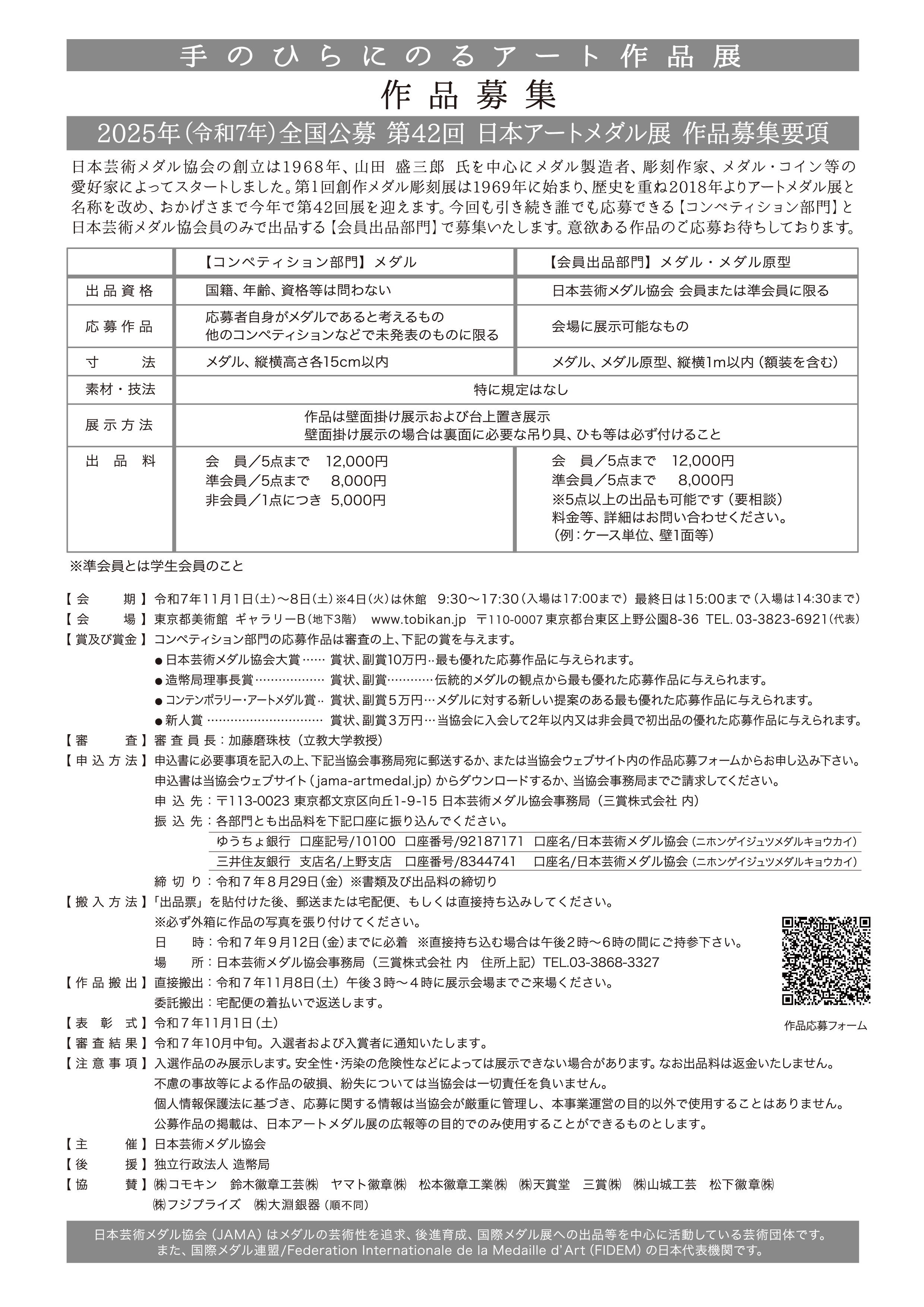 - 応募作品の掲載は、日本アートメダル展の広報等の目的でのみ使用することができるものとします